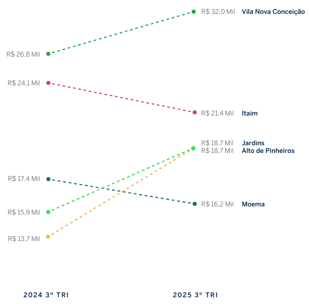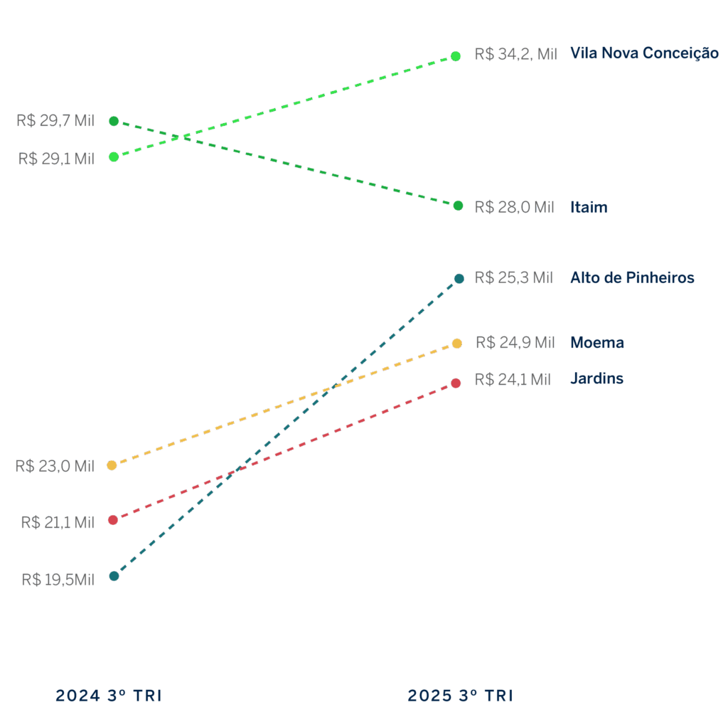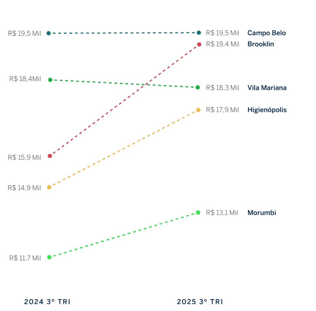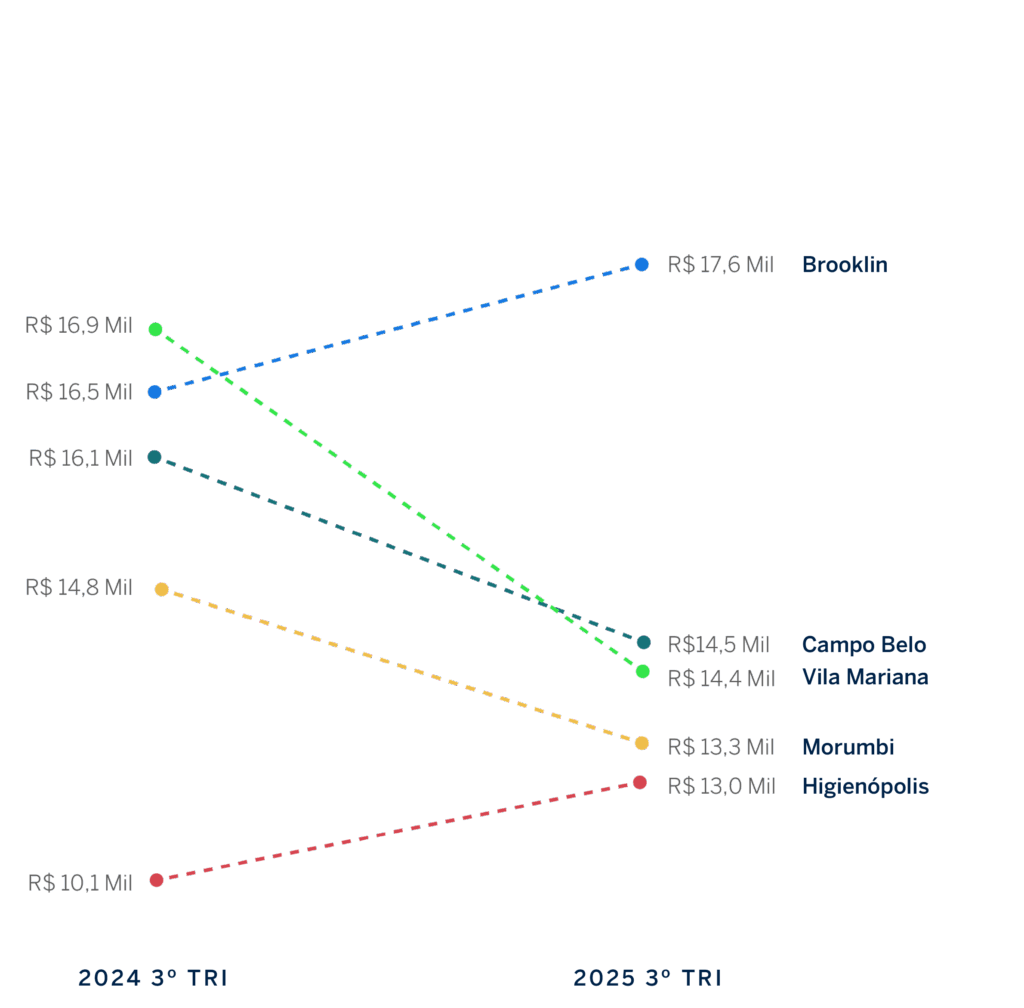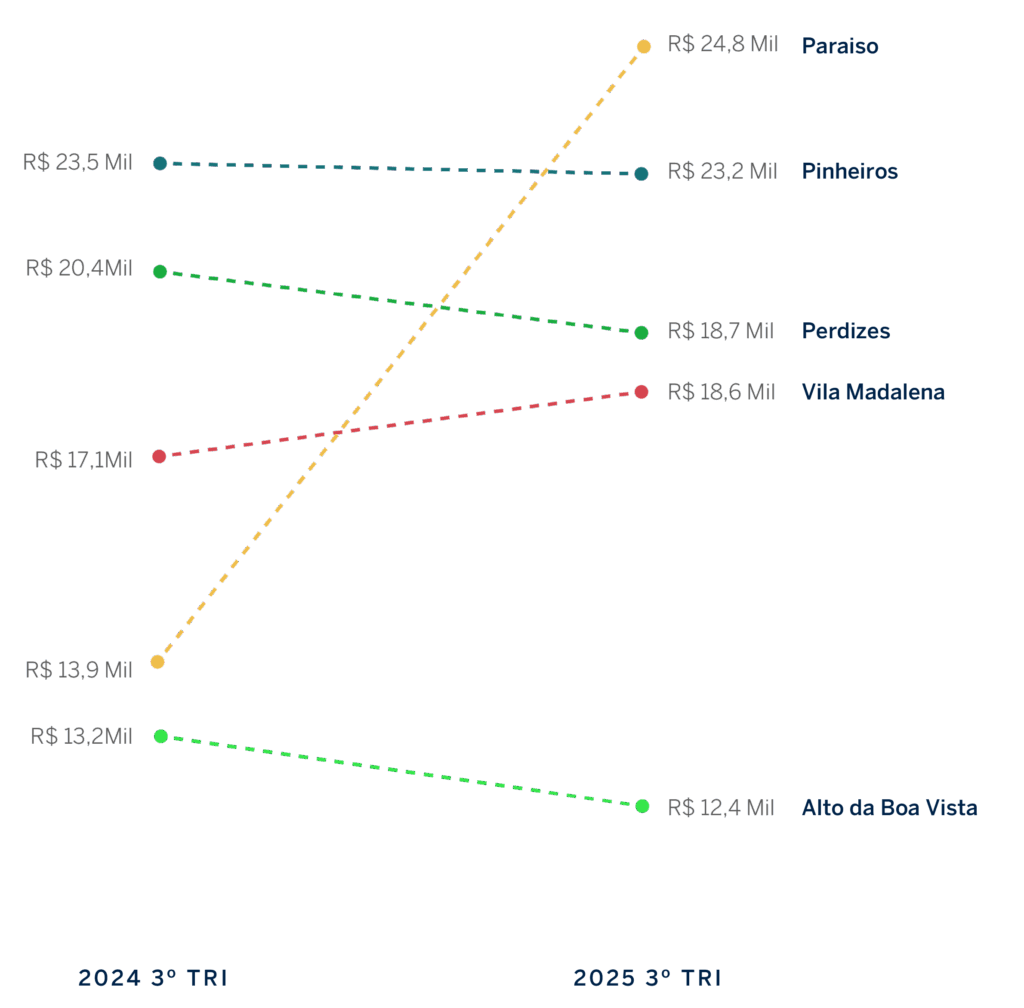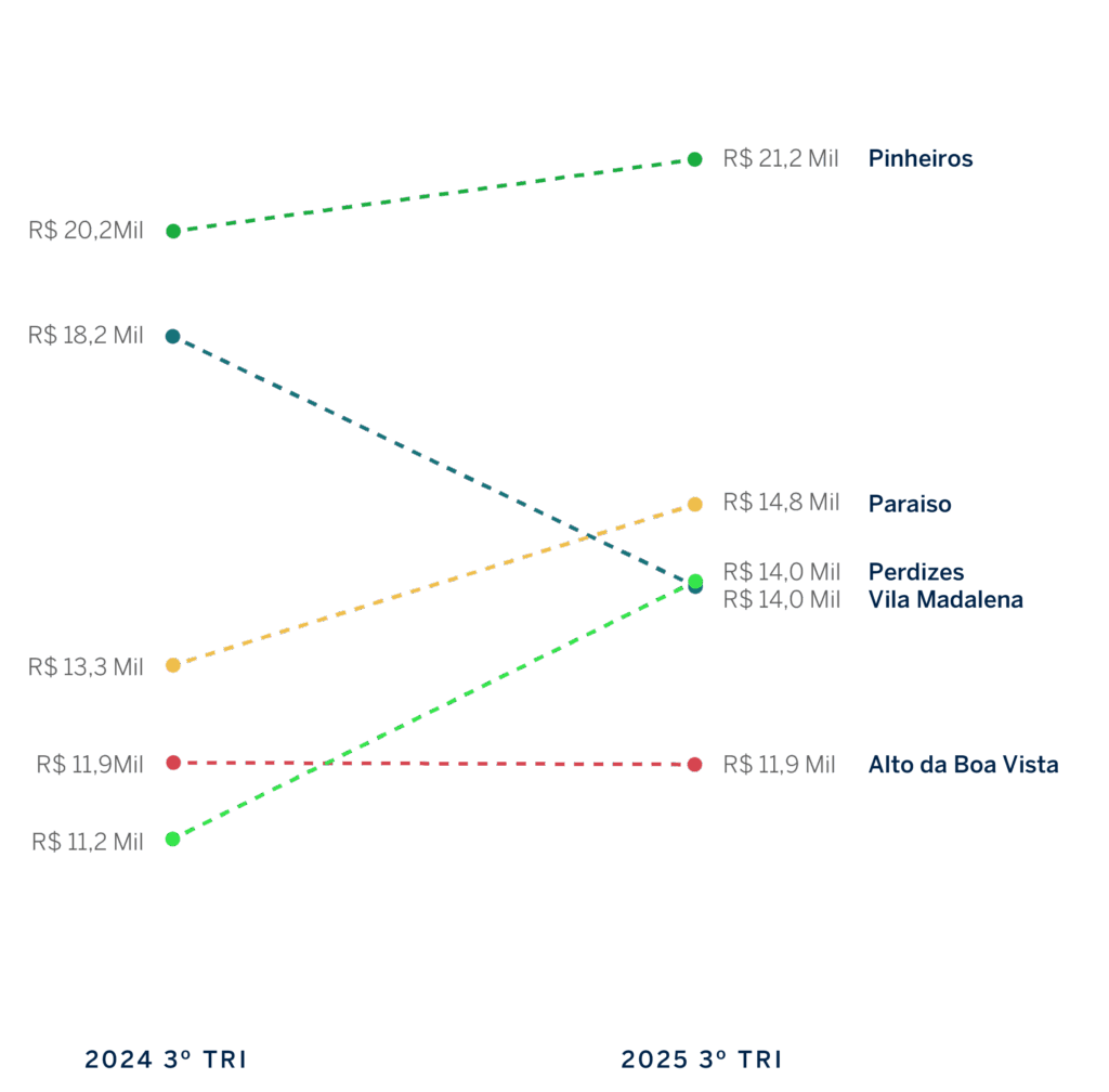 Confira abaixo as movimentações de mercado da mediana dos valores dos anúncios (R$/m²), agrupados por conjuntos de bairros: